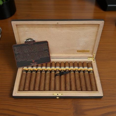 "First Habanos Gran Reserva! 2003 harvest tobacco with 5 years of aging. Only 5,000 numbered boxes (25 cigars). Black lacquered box with gold Gran Reserva band."